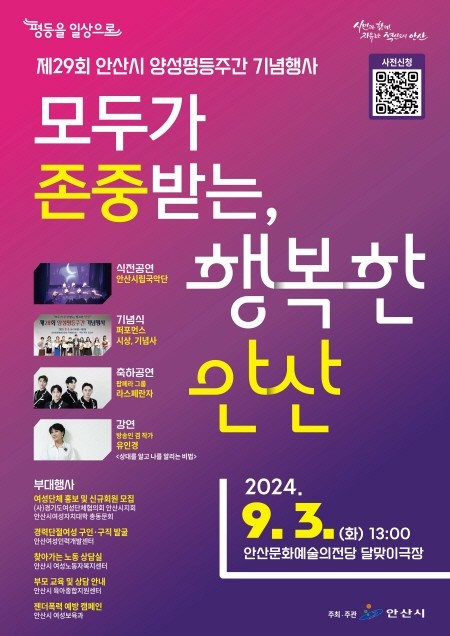 | ▲제29회 안산시 양성평등주간 기념행사 ‘모두가 존중받는, 행복한 안산’ 포스터(사진=안산시) |