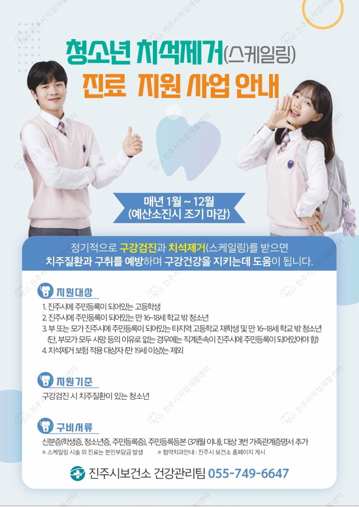 청소년 치석제거 진료비 지원사업은 진주에 주소를 두고 있는 고등학교 재학생(1~3학년) 또는 16~18세의 학교 밖 청소년이거나 부 또는 모가 진주시에 주소를 두고 있는 16~18세 청소년 중 구강검진결과 치주질환이 확인된 경우 진료비용을 지원받을 수 있다.