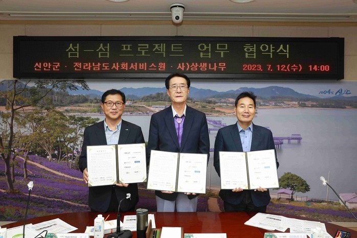 [전남=프레스뉴스] 강래성 기자= 신안군(군수 박우량)은 12일 도서지역 맞춤형 사회서비스 제공을 위한 ‘섬-섬(Service Union Model) 프로젝트’의 원활한 추진을 위해 전라남도사회서비스원(원장 강성휘), 사단법인 상생나무(이사장 김종익)과 업무협약을 체결했다고 전했다.