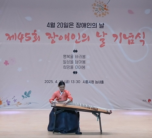 ▲지난 18일 시청 늠내홀에서 열린 제45회 장애인의 날 기념식에서 시각장애인 가야금 연주자 김보경 씨가 공연하고 있다.(사진=시흥시) |