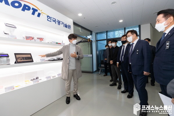 | ▲ 지난 4일 오후 한국광기술원 경기분원에서 염태영 경제부지사와 최대호 안양시장, 신용진 한국광기술원장 등 참석자들이 시설 투어를 하고 있다.(사진=경기도) |