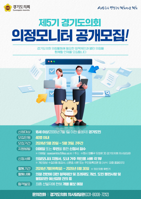 [프레스뉴스] 류현주 기자= 경기도의회는 의정활동에 필요한 도민의 다양한 의견을 수렴하고 소통하는 의회, 열린 의회 구현을 위해 제5기 의정모니터 40명을 공개 모집한다.