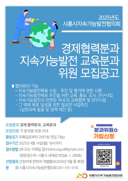 [프레스뉴스] 장현준 기자= 시흥시지속가능발전협의회(공동대표 임병택 시흥시장, 오인열 시흥시의회 의장, 김주석 대표회장/이하, 시흥시지속협)는 2025년 경제ㆍ협력분과 및 지속가능발전 교육분과 위원을 공개 모집한다.