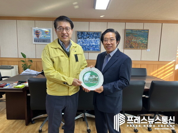 | ▲ 안산시산업역사박물관, 박창화(주)에이치텍건축사사무소 부회장 으로부터 반월지구출장소 청사 준공기념 유물 기증의사를 전달받았다.(왼쪽부터 김대순 안산시부시장,박창화 ㈜에이치텍건축사사무소 부회장)사진=안산시 |