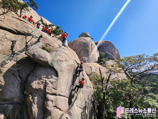 ▲ 가을철 북한산에서 산악구조 합동훈련을 하는 경기북부 소방관들(사진=경기도북부청) |