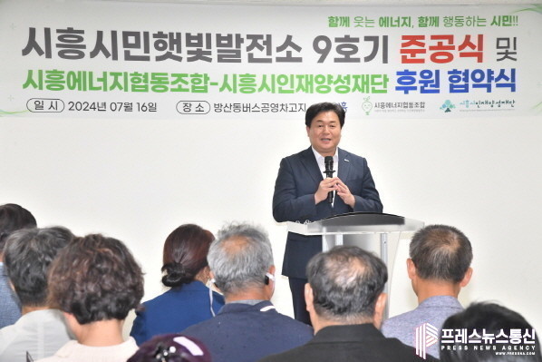 [프레스뉴스] 장현준 기자= 시흥시(시장 임병택)는 지난 16일 시흥에너지협동조합(이사장 서정미)이 방산버스공영차고지(시흥시 청룡저수지길 366)에서 시흥시민햇빛발전소 9호기 준공식을 개최하고, 시흥시인재양성재단(이사장 임병택)과 후원 협약을 체결했다고 밝혔다.