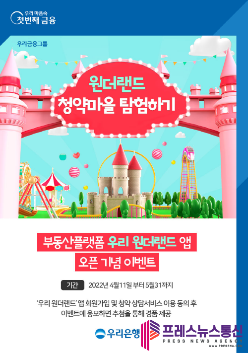 [프레스뉴스] 김대일 기자= 우리금융지주의 자회사 우리은행(은행장 이원덕)은 부동산플랫폼 ‘우리원더랜드’ 앱의 주택 청약컨설팅 서비스 오픈을 기념해‘원더랜드 청약마을 탐험하기’이벤트를 5월 31일까지 실시한다고 22일 밝혔다.