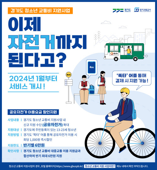 한편, 경기도는 2020년부터 ‘청소년 교통비 지원사업’을 통해 도내 청소년이 대중교통 이용 시 연간 최대 12만 원을 지원하고 있다.