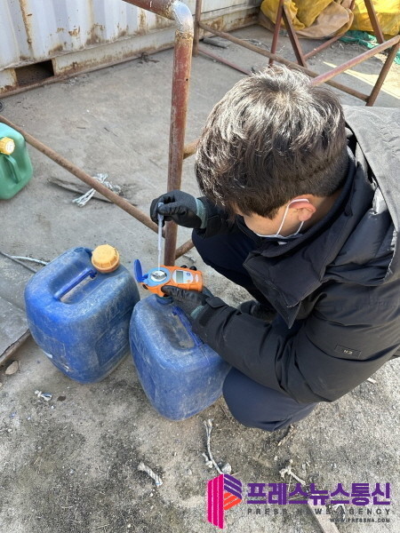 | ▲간이 염산측정기를 이용하여 무기산 농도 측정 중인 어업감독공무원(사진=경기도) |