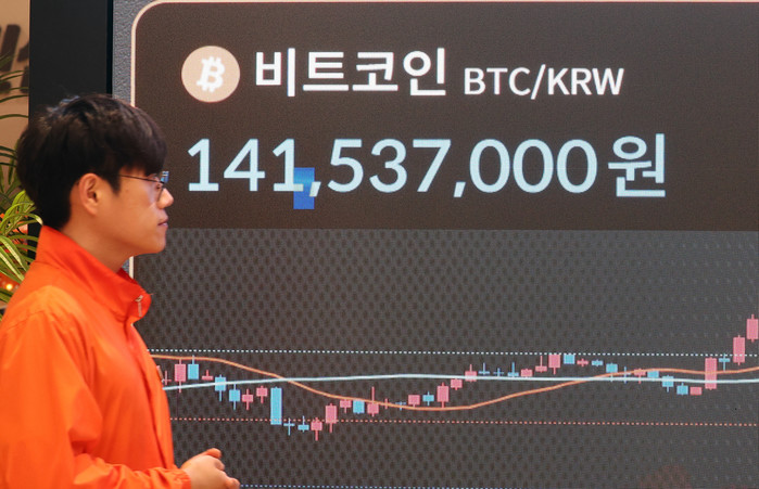 | ▲ 17일 오후 서울 서초구 빗썸 라운지 전광판에 비트코인 가격이 1억4100만원대를 나타내며 하락세를 보이고 있다. /사진=뉴스1 |