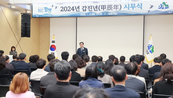 이날 시무식은 국민의례, 표창 수여, 진병영 군수 신년사, 군민가 제창 등으로 진행된 가운데 표창은 민간인과 관계기관, 함양군 기관 표창, 부서 표창, 공무원 표창 순으로 총 50건의 표창을 수여했다.
