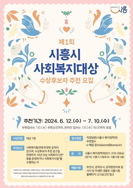 유재홍 시흥시 복지국장은 “다양한 사회복지 분야에서 두각을 나타낸 시민들의 공로를 인정하고, 그들의 노력과 기여를 널리 알릴 수 있도록 관심과 추천을 부탁드린다”라고 말했다.