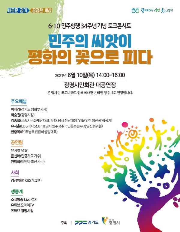 경기도가 광명시와 공동주최하는 이번 토크콘서트는 ‘5·18 민주화 운동→6·10 민주항쟁→6·15 남북정상회담’으로 이어지는 역사적 흐름을 되새기고, 우리나라 민주화 운동을 연상케 하는 미얀마의 평화를 기원하며 도민의 평화공감대 확산을 위해 마련된 행사이다.