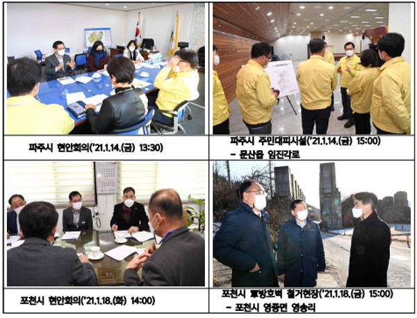 이 밖에도 영송리 군방호벽 철거 사업이 경기도 예산 지원을 통해 올해 6월까지 준공될 수 있도록 하는 방안도 함께 검토했으며, 이날 현장 군 관계자로부터 건의를 받았던 아프리카돼지열병(ASF) 방역 울타리 설치 등에 대해서는 도 환경부서와 포천시와 협력해 처리하도록 했다.