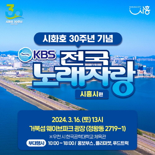 [프레스뉴스] 장현준 기자= 시흥시(시장 임병택)는 3월 16일 오후 1시에 거북섬 웨이브파크 광장에서 시화호 30주년 기념 KBS 전국노래자랑을 개최한다고 밝혔다.