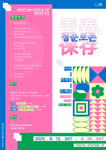 시 관계자는 “‘청춘보존’은 청년의 감정을 있는 그대로 담아내고, 예술이라는 매개체를 통해 지역사회와 청년이 함께 공감하는 소통의 장”이라며 “청년작가의 성장을 지원하는 시도가 곧 시흥시의 문화적 저력이 되고, 향후 청년친화도시로 도약하는 과정에서 도시와 청년 모두가 함께 성장하는 밑거름이 될 것”이라고 밝혔다.