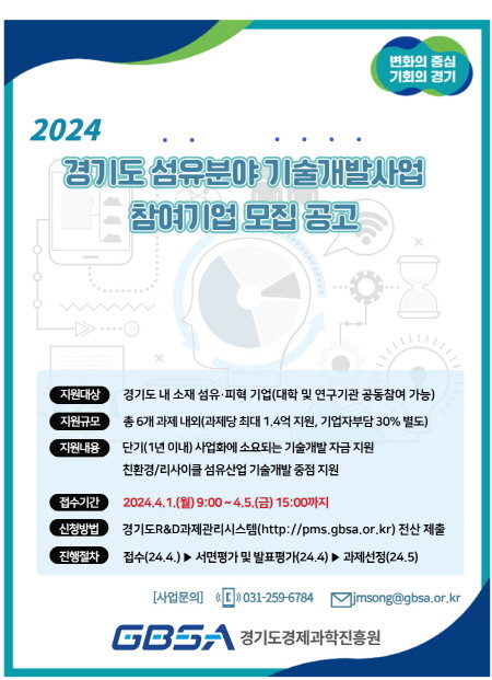 ▲2024 경기도 섬유분야 기술개발사업 참여기업 모집 공고 포스터(사진=경기도경제과학진흥원) |