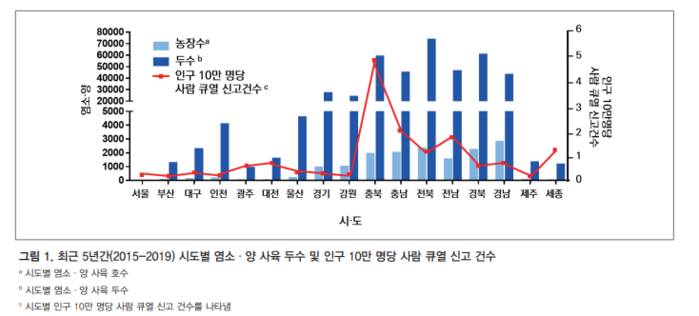 ▲최근 5년간(2015~2019) 시도별 염소·양 사육 두수 및 인구 10만 명당 사람 큐열 신고 건수 그래픽(사진=경기도북부청) |