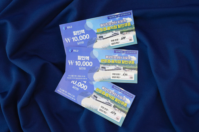 | ▲완도군은 해양치유센터 관외 이용객에게 음식점 할인 쿠폰을 제공하는 이벤트를 완도읍을 포함한 군외면, 신지면, 고금면, 약산면의 음식점까지 확대하여 추진한다.(사진제공=완도군) |