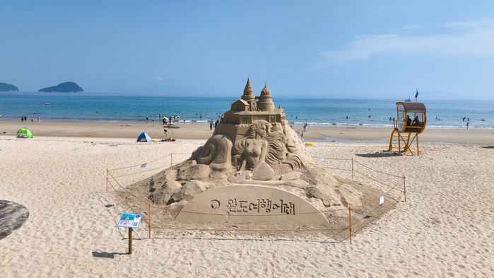 모래조각 작품은 백사장 중앙과 완도해양치유센터 입구에 ‘인어공주의 성’, 완도해양치유센터 옆 이벤트 광장에는 ‘바다를 품은 마린 보이’가 8월 초 완성돼 포토존으로 자리 잡았다.