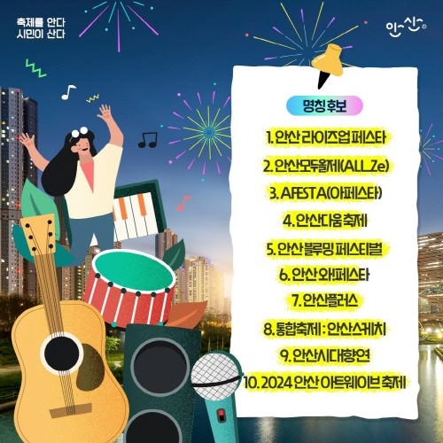 [프레스뉴스] 장현준 기자= 안산시(시장 이민근)는 오는 24일까지 안산시 통합축제 명칭 공모전 1차 심사 결과 선정한 10개의 후보작을 대상으로 대시민 선호도 조사를 진행한다고 19일 밝혔다.