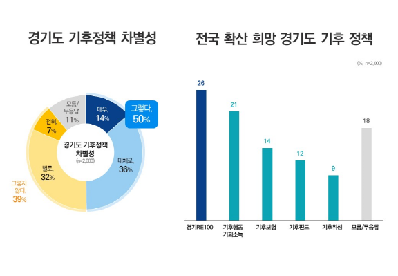 도민 절반(50%)은 경기도 기후정책이 중앙정부나 다른 지자체와 차별성이 있다고 평가해 ‘그렇지 않다’는 응답(39%)을 웃돌았다.