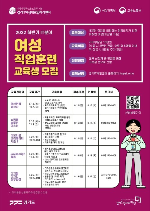 | ▲ 2022년 하반기 여성직업훈련 교육생 모집 포스터(사진=경기도일자리재단) |