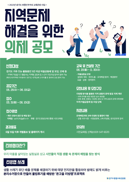 ▲ 2022년 경기도 마을민주주의 교육운영 사업, 지역문제 해결을 위한 의제 공모 포스터 (사진=경기도평생교육진흥원) |