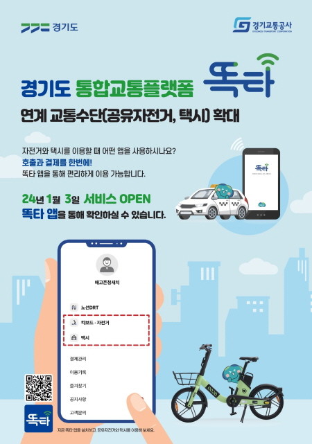 ▲ 경기도 통합교통플랫폼 똑타 앱 연계 교통수단(공유자전거·택시) 확대 안내 포스터(사진=경기교통공사) |