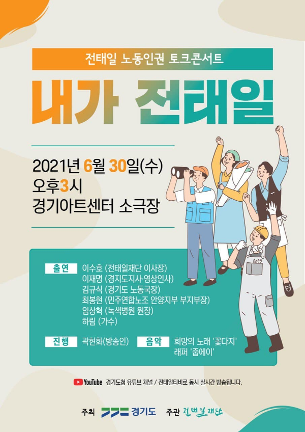 이번 전태일 노동인권 토크콘서트는 비대면 온라인 방식으로 진행되며, 참여를 희망하는 이는 30일 오후 3시부터 경기도청 유튜브 채널 또는 전태일티비를 통해 실시간으로 참여할 수 있다.