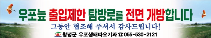 창녕군은 우포늪 AI 확산 방지를 위해 지난달 16일부터 시행된 우포늪 탐방로 출입 제한 조치에 대해 우포늪 인근에 3주 이상 고병원성 AI 추가 발생이 없고, 창녕 고병원성 AI 발생 예찰지역 내 가축 이동 제한 해제 상황을 감안해 우포늪 출입 제한 탐방로를 전면 개방하기로 결정했다.
