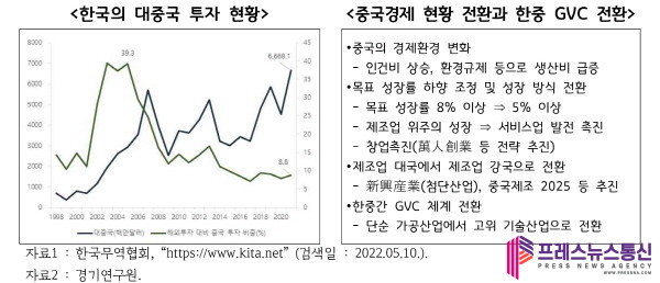 | ▲ 한국의 대중국 투자형황_중국경제 현황 전환과 한중 GVC 전환 그래픽(사진=경기연구원) |