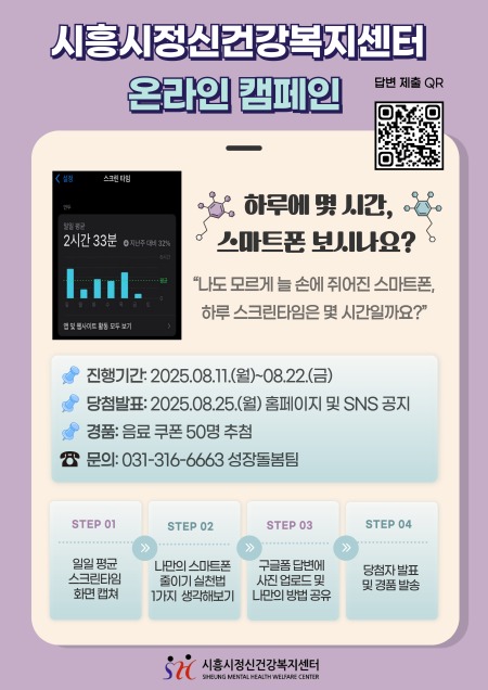 참여 방법은 ▲스마트폰 과의존 자가 점검표와 사용 습관 개선 방법을 담은 카드뉴스 확인 ▲참여자 본인의 일일 평균 ‘스크린타임’ 캡처 화면 제출 ▲본인만의 스마트폰 사용 줄이기 실천법 작성 순으로 진행된다. 참여 결과는 8월 25일 시흥시정신건강복지센터 누리집에서 발표된다.