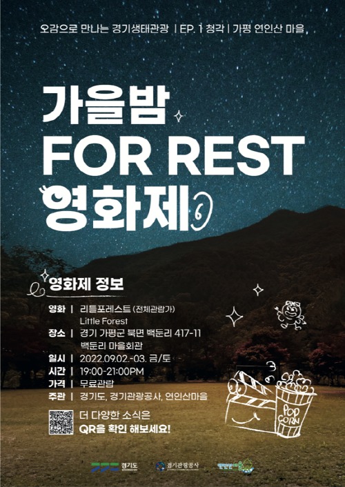 [프레스뉴스] 장현준 기자= 경기도와 경기관광공사가 9월 2일과 3일 경기도 생태관광거점인 가평군 연인산마을에서 무료 영화 상영을 하고 경품을 제공하는 ‘(포레스트)FOR REST 영화제’를 개최한다.