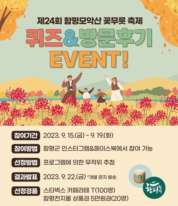 퀴즈이벤트는 제시된 이미지를 보고 함평의 대표 축제명을 맞히는 것이며 방문 후기 이벤트는 꽃무릇 축제를 방문한 사진을 개인 SNS에 업로드하고 인증사진을 제출하면 된다.