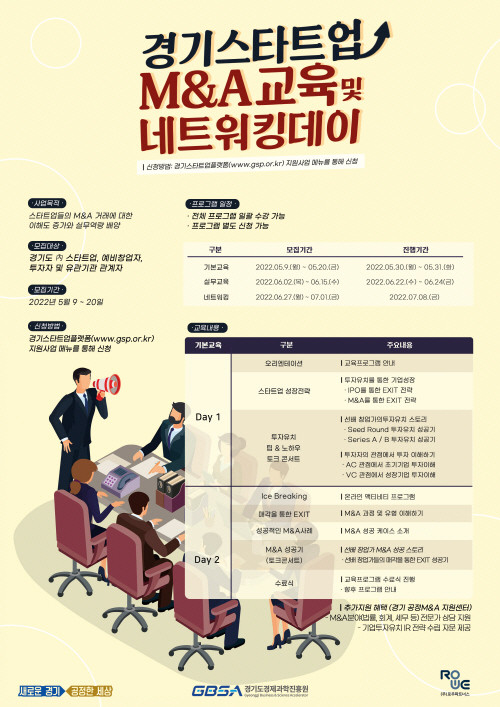 [프레스뉴스] 강보선 기자= 경기도는 엠앤에이(M&A)에 관심 있는 도내 스타트업의 전문 역량 강화를 위한 ‘2022 스타트업 엠앤에이(M&A) 교육 및 네크워킹 데이’ 프로그램을 운영한다고 9일 밝혔다.