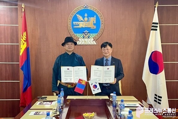 | ▲안산시-몽골 우브르항가이주, 국제 우호 도시 관계 수립 교류의향서 교환(왼쪽부터 이슈도르지 도르즈렌 우부르항가이 주지사, 박근호 안산시 정책보좌관)사진=안산시 |