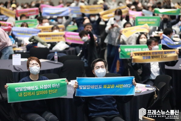 행사에는 발달장애인 당사자와 조력자 700여 명이 함께해 슬로건 제창, 발달장애인 관련 사례발표, 자유발언이 이뤄졌으며 대회 준비에 발달장애인들이 직접 참여해 의미를 더했다.