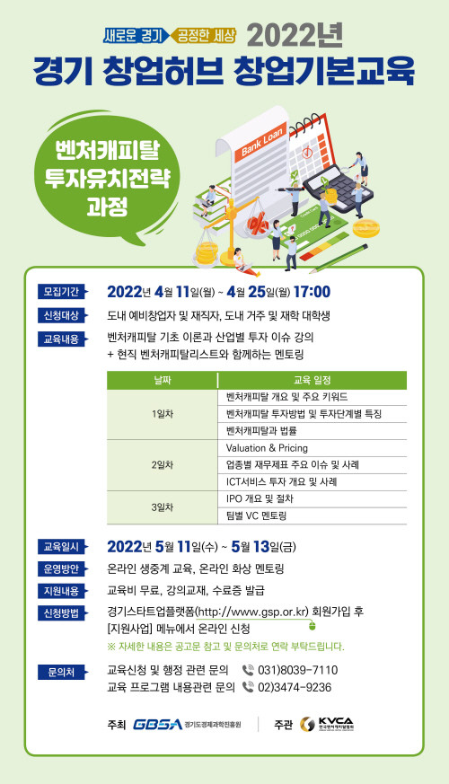 경기도와 경기도경제과학진흥원은 올해 5월 이 같은 내용의 ‘2022 경기창업허브 벤처캐피탈 투자유치전략 과정’을 운영, 프로그램에 참여할 교육생 45명을 모집한다고 11일 밝혔다.