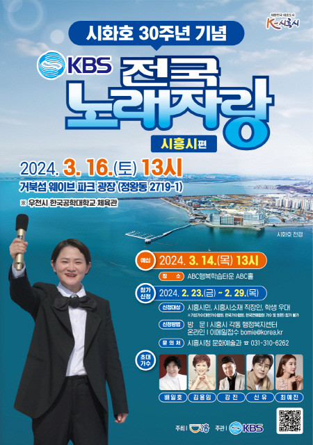 [프레스뉴스] 장현준 기자= 시흥시(시장 임병택)가 오는 3월 16일 오후 1시에 시흥 거북섬 웨이브파크 광장(정왕동 시화MTV 88호 문화공원 일원)에서 국내 최장수 예능프로그램인 ‘KBS 전국노래자랑’을 개최한다.