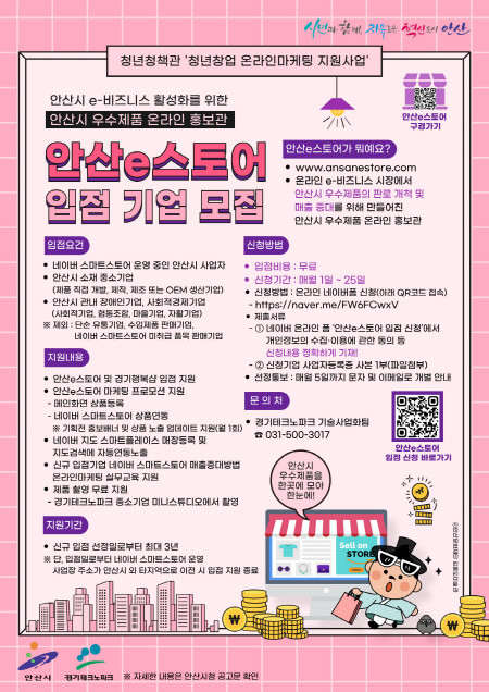 입점 대상은 안산시 관내 사업자로 안산시에 본사 또는 생산시설이 있는 ▲중소기업 ▲장애인기업 ▲사회적경제 기업이며, 네이버 스마트스토어 쇼핑몰을 통해 완제품을 판매할 수 있어야 한다.