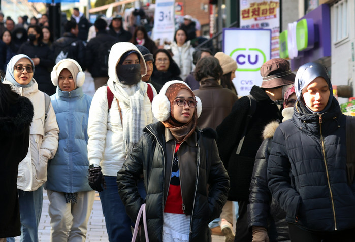 | ▲ 21일 서울 명동에서 외국인 관광객들이 추운 날씨속에서 연말을 보내고 있다./사진-뉴스1 |