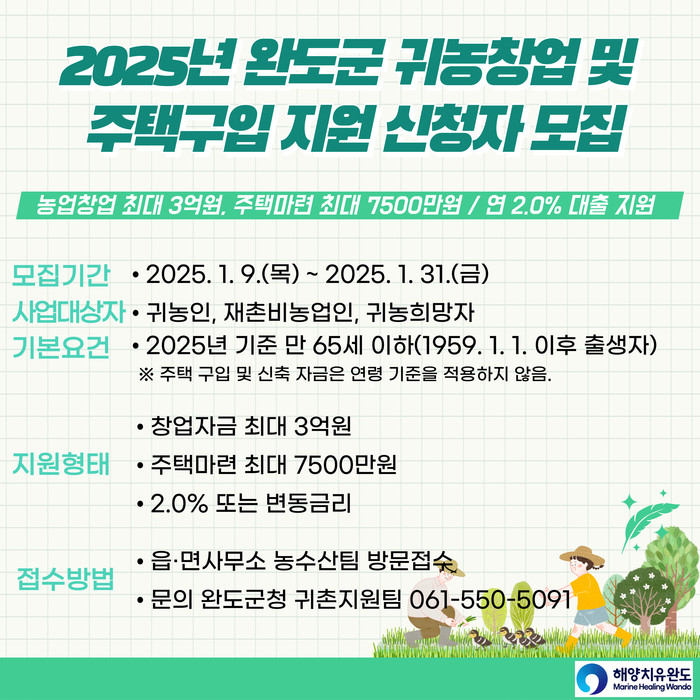 ▲귀농인이 안정적으로 농업·농촌에 정착할 수 있도록 농업창업 및 주거 공간 마련을 지원하고자 「2025년 귀농 농업 창업 및 주택 구입 지원 사업」 신청자를 모집한다.(사진제공=완도군) |