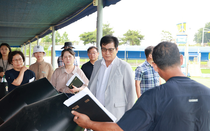 햇빛 노출이 장시간 이어지는 상황을 고려해 차광막 및 인조 잔디 매트 설치 상태도 세심히 살피며, 작은 위험 요소까지 놓치지 않겠다는 자세로 점검에 임했다.