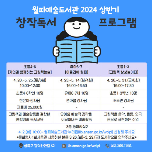 [프레스뉴스] 장현준 기자= 안산시(시장 이민근) 월피예술도서관은 상반기 유아와 어린이를 위해 연령별로 ‘창작 독서’ 강좌를 운영한다고 15일 밝혔다.