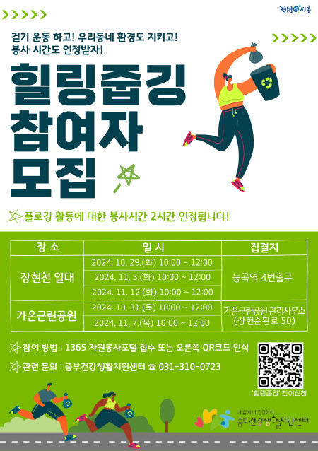 ‘힐링 줍깅’은 걷기 운동을 하면서 주변 쓰레기를 줍는 환경 보호 활동이다. 시민들은 장현천 일대와 가온근린공원에서 활동하며, 깨끗한 동네 만들기에 동참할 수 있다. 시는 이번 프로그램을 통해 건강한 생활 습관을 형성하고, 지역 환경 개선에 앞장선다.