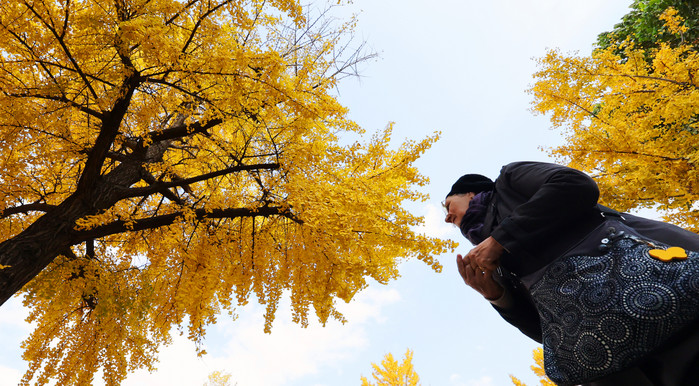 | ▲ 9일 오후 서울 종로구 효자로에서 외국인 관광객과 시민들이 노랗게 물든 은행나무와 함께 즐거운 시간을 보내고 있다./사진=뉴스1 |