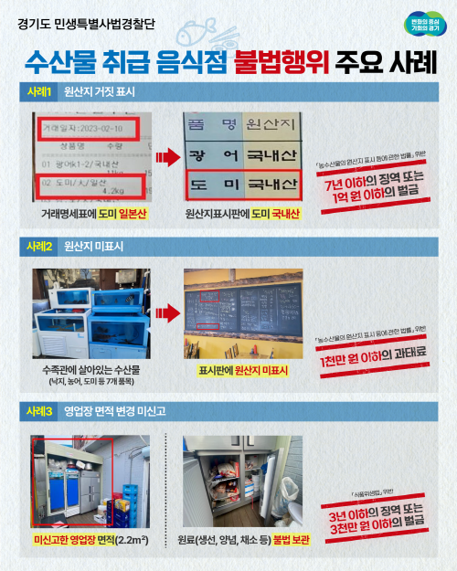 | ▲ 경기도 특사경, 수산물 취급 음식점 불법행위 주요 사례 그래픽자료(사진=경기도) |