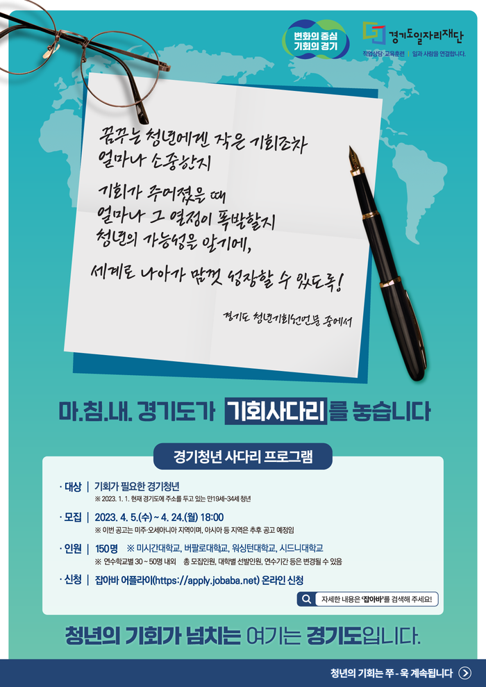 경기도일자리재단 관계자는 “다양한 프로그램을 통해 ‘더 나은 미래’에 도전할 수 있는 기회가 되길 바라며, 많은 지원자가 접수할 것으로 예상되기에, 관심 있는 청년들은 서둘러 지원해주길 바란다”라고 당부했다.