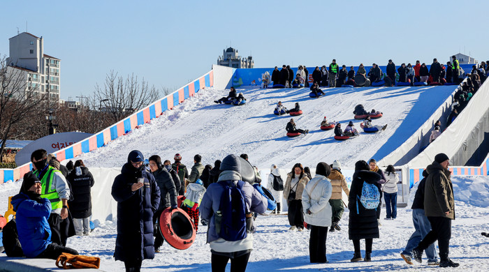 | ▲ 31일 서울 광진구 뚝섬한강공원 눈썰매장을 찾은 외국인 관광객들과 시민들이 썰매를 즐기고 있다./사진-뉴스1 |